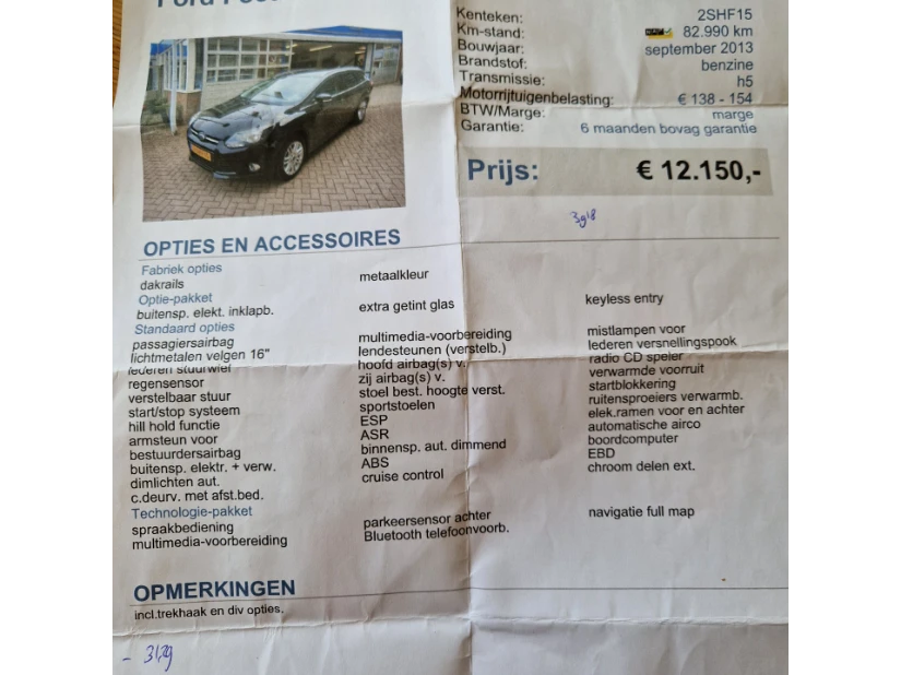 Te koop aangeboden: nette en compleet uitgeruste Ford Focus Wagon in de Titanium uitvoering uit 2013. De auto rijdt momenteel niet. De garage heeft de auto uitgelezen en er zijn motor-gerelateerde foutcodes gevonden (zie foto). Het vermoeden is een defecte koppakking, maar verdere diagnose is niet uitgevoerd, waardoor mogelijke aanvullende motorschade niet uitgesloten kan worden. De motor is vervangen in mei 2022 en de huidige kilometerstand bedraagt 146.625 km. De auto wordt verkocht in de huidige staat en is interessant voor iemand die deze wil repareren, reviseren of gebruiken voor onderdelen of export. Gegevens Bouwjaar: 2013 Brandstof: Benzine Transmissie: Handgeschakeld Kilometerstand: 146.625 km APK: geldig tot 23 mei 2026 Uitvoering: Titanium Opties / extra’s Navigatie Cruise control Climate control Parkeersensoren Lichtmetalen velgen Reservewiel (nieuw) aanwezig Staat van de auto Auto rijdt niet Vermoeden: koppakking / mogelijke motorschade Motor vervangen in mei 2022 Over het algemeen nette auto Lichte gebruikssporen / kleine krassen aan bestuurderszijde De auto staat momenteel bij een garage in Goirle en kan daar worden opgehaald. Ik sta open voor een net en realistisch bod.
