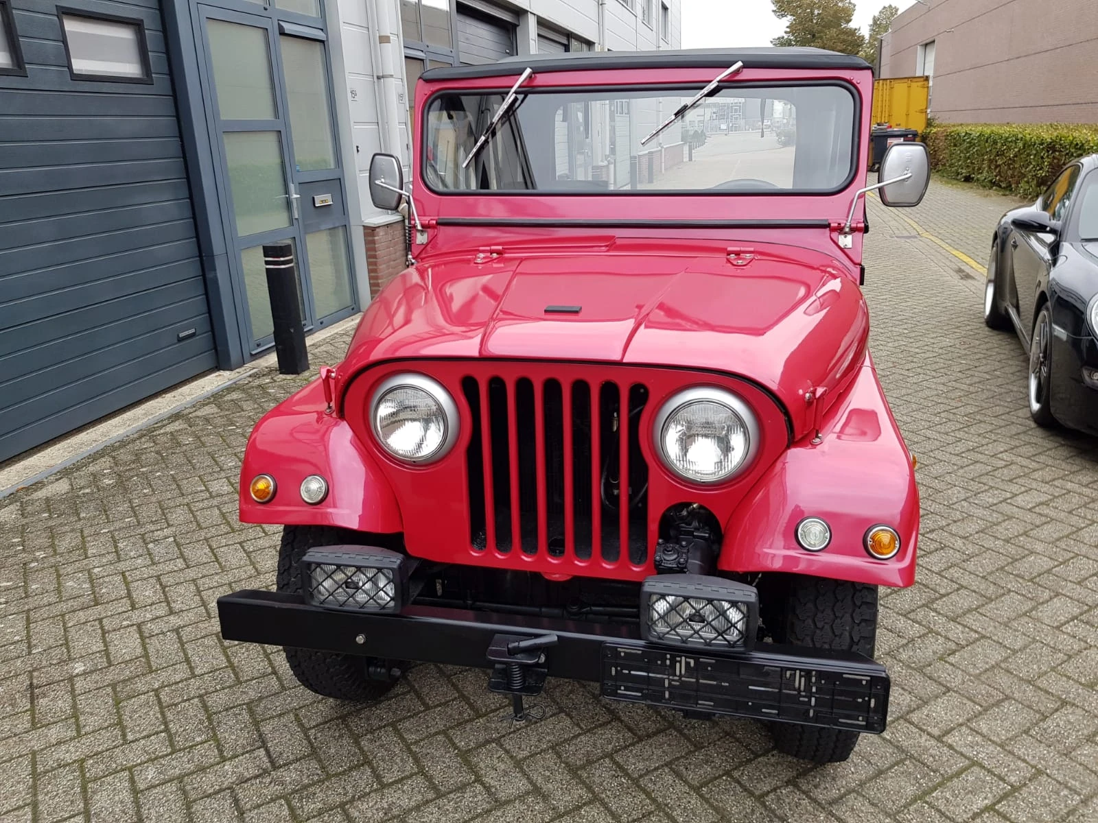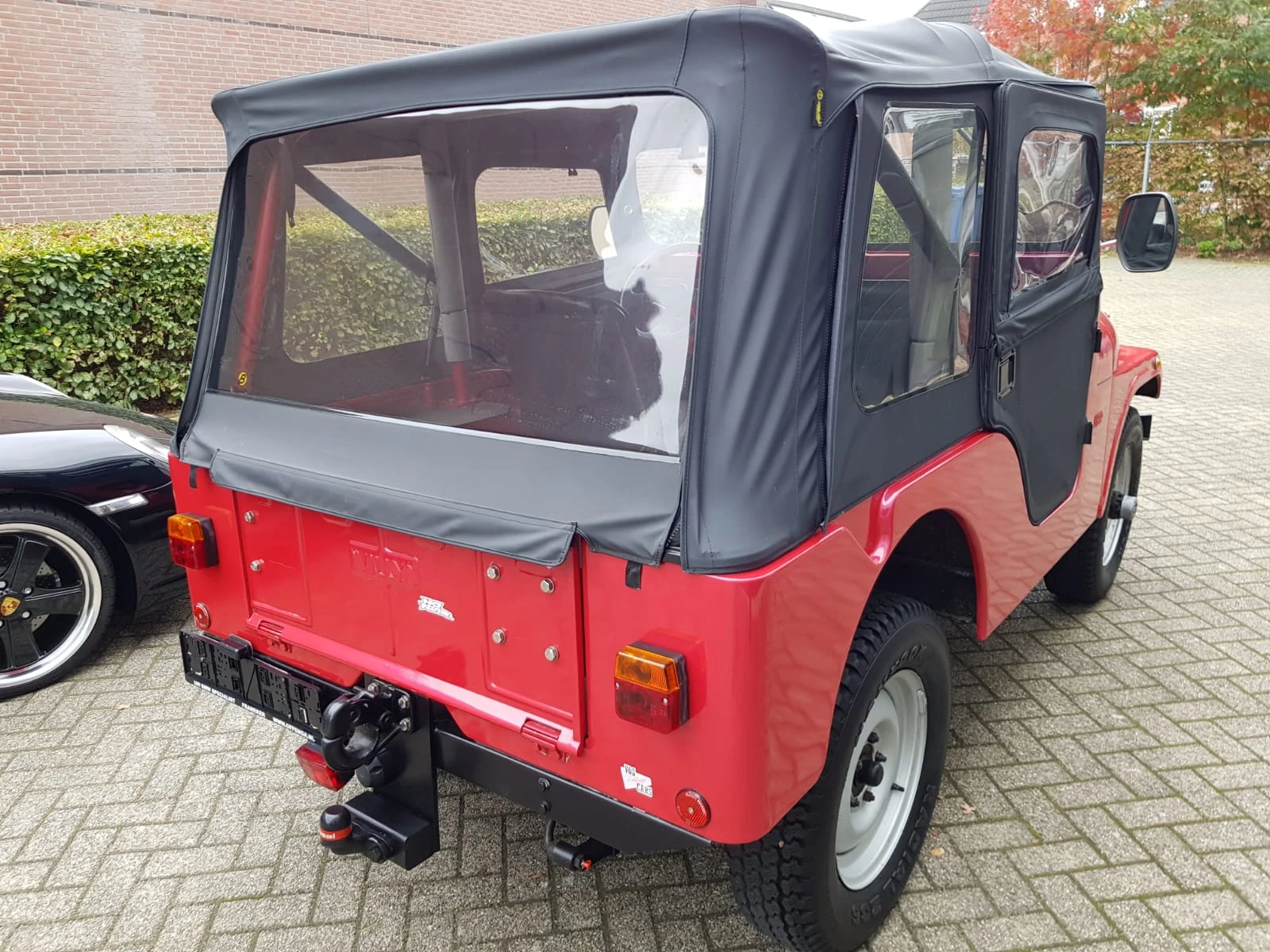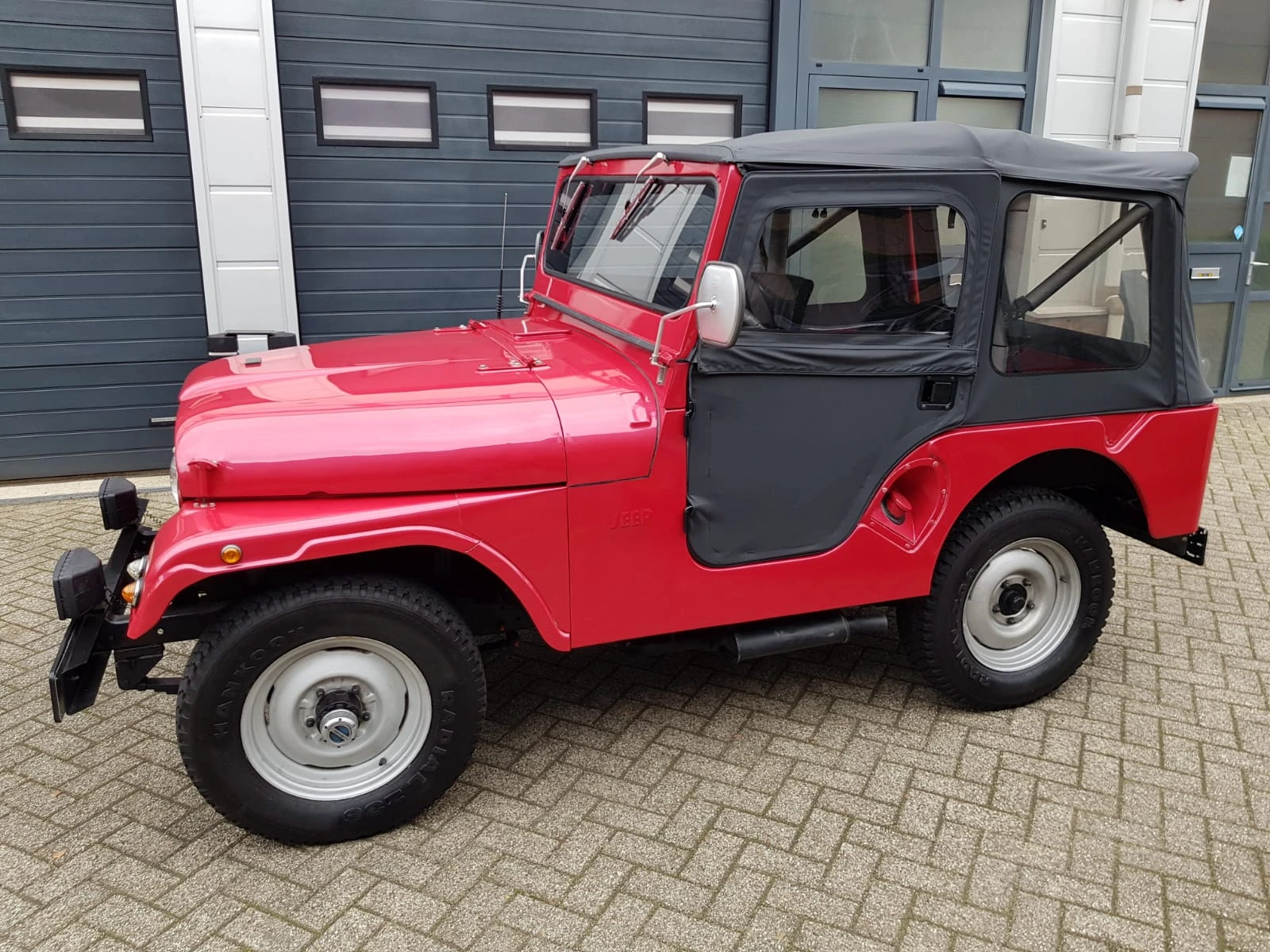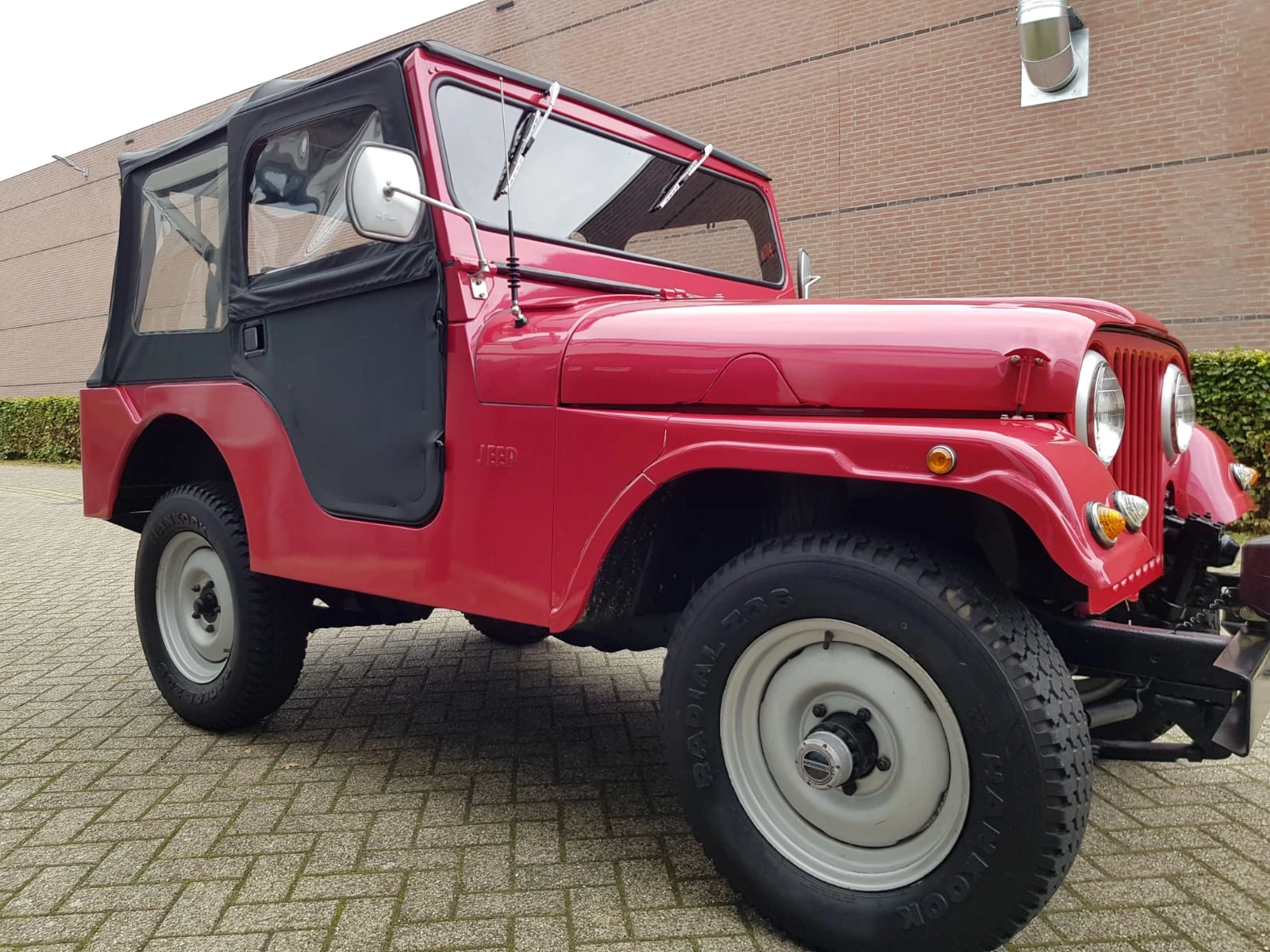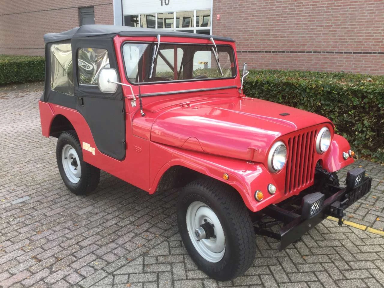 Rouge métallisé. Capote noire. Intérieur simili cuir noir. Année de construction 1956. Moteur turbo diesel Endenor (peugeot). Tout fonctionne sur la Jeep. Pas de dommage. Toit cabriolet parfait. Feux de brouillard. La voiture a une immatriculation belge. Plaque d'immatriculation complète présente. Pneus etc en bon état. Boîte de vitesses manuelle 3 d'origine avec rapport élevé et bas.